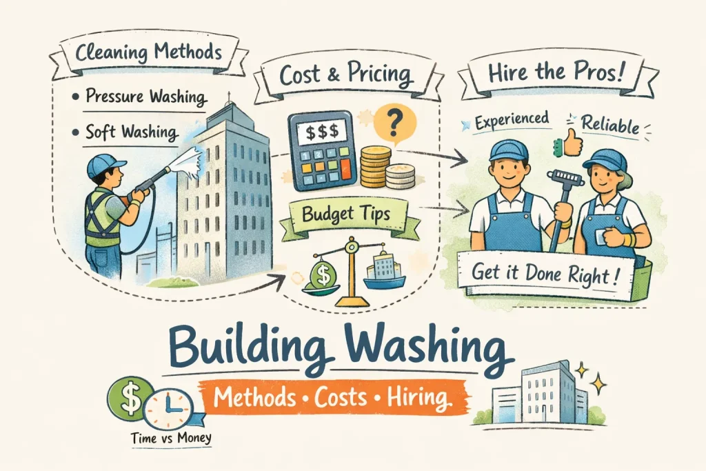 “Building washing” bundles several related services: façade and storefront cleaning, professional window washing, gutter clearing, roof soft‑washing, dumpster pad sanitizing, parking and hardscape cleaning, and solar array maintenance. Together these keep a property market‑ready, structurally sound, and safe for occupants.